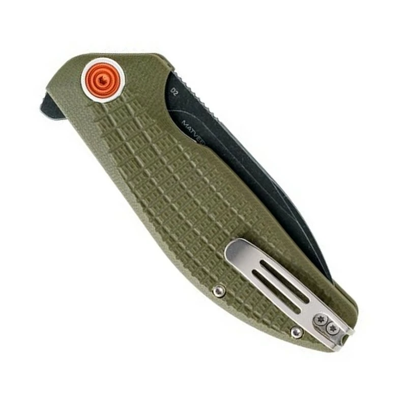 Manche en G10 vert, d’une longueur de 11,5 cm.