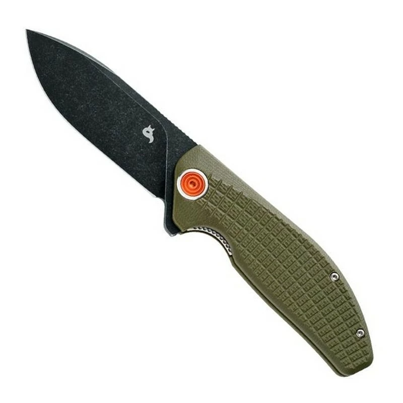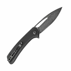 Lame en acier D2 avec revêtement PTFE noir et finition « blackwash » avec « flipper » et cran intérieur.