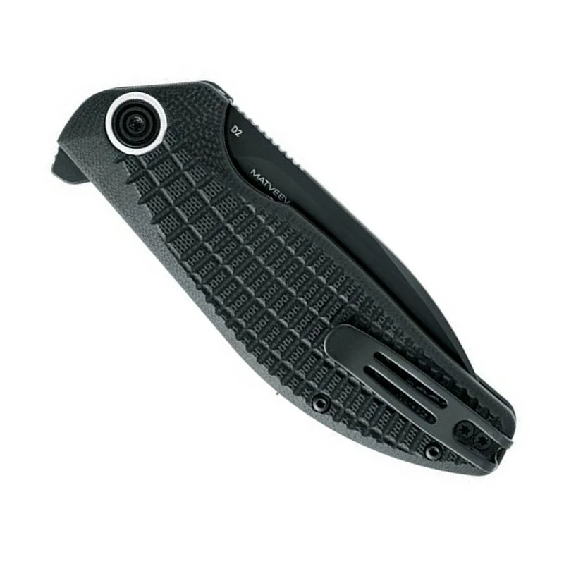 Lame en acier D2 avec revêtement PTFE noir avec « flipper » et cran intérieur.