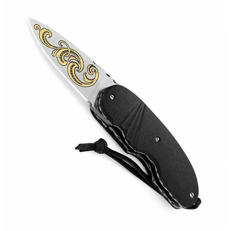 Lame en acier inox N690Co satiné à cran de verrouillage intérieur, gravure or 24 carats déposé par un procédé électrochimique.