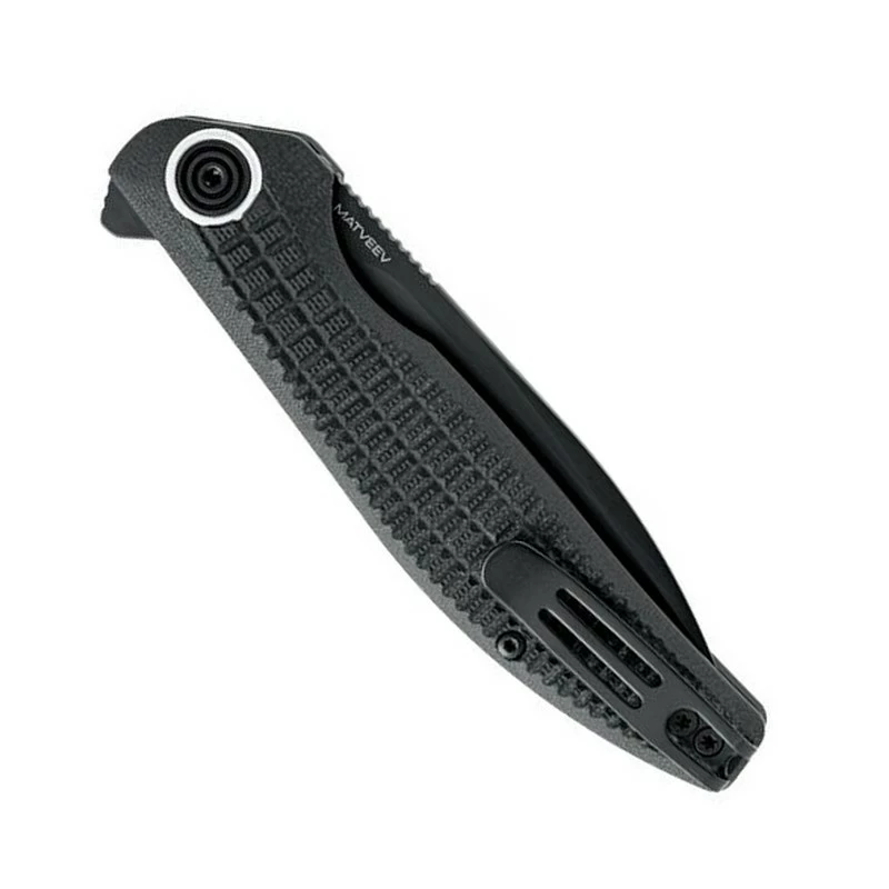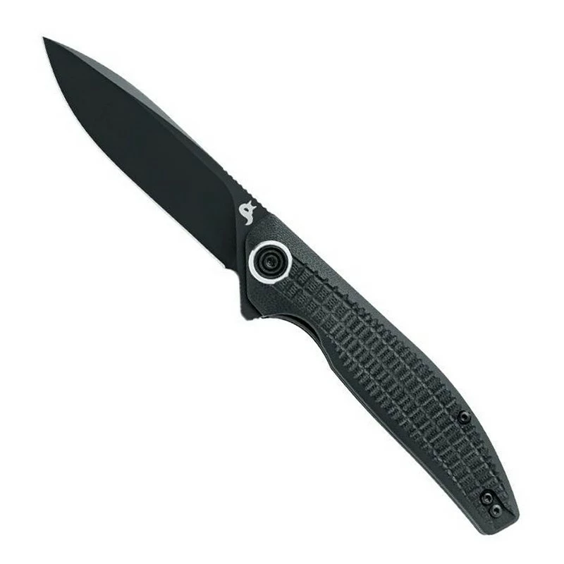 Lame en acier D2 avec revêtement PTFE noir avec « flipper » et cran intérieur.