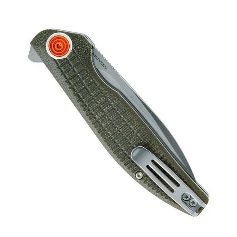 Lame en acier D2 finition « stonewashed » avec « flipper » et cran intérieur.