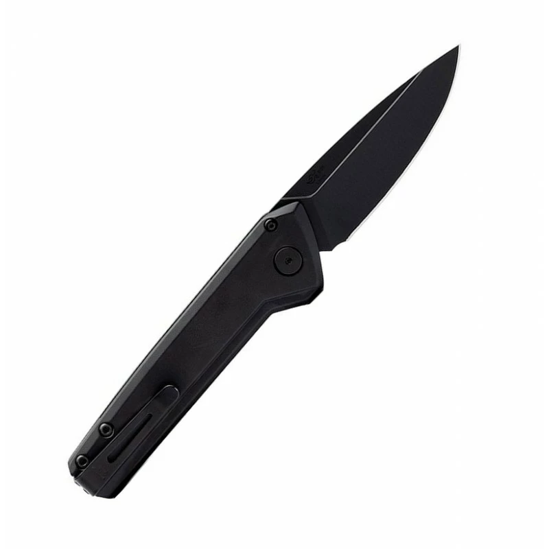 Lame drop-point en acier S35VN avec sécurité, d’une longueur de 8,5 cm.
