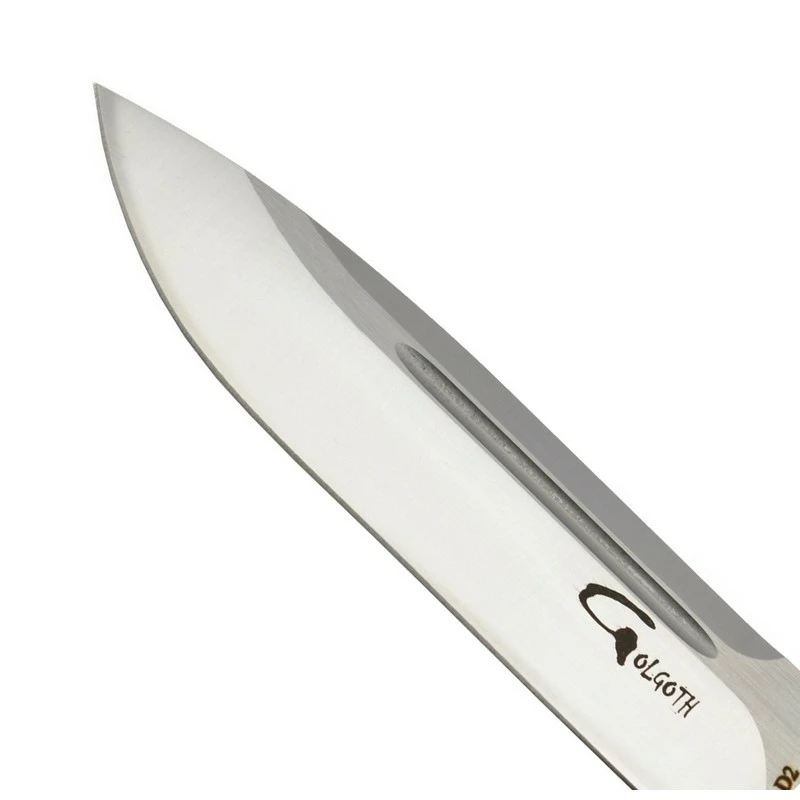Lame drop point en acier inox D2 simple tranchant, d’une longueur de 8 cm.