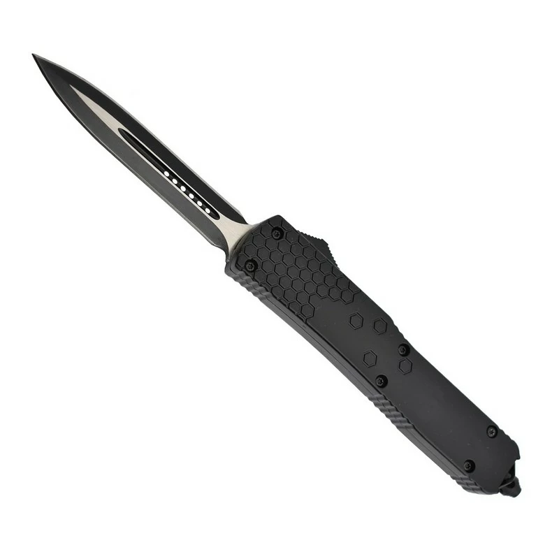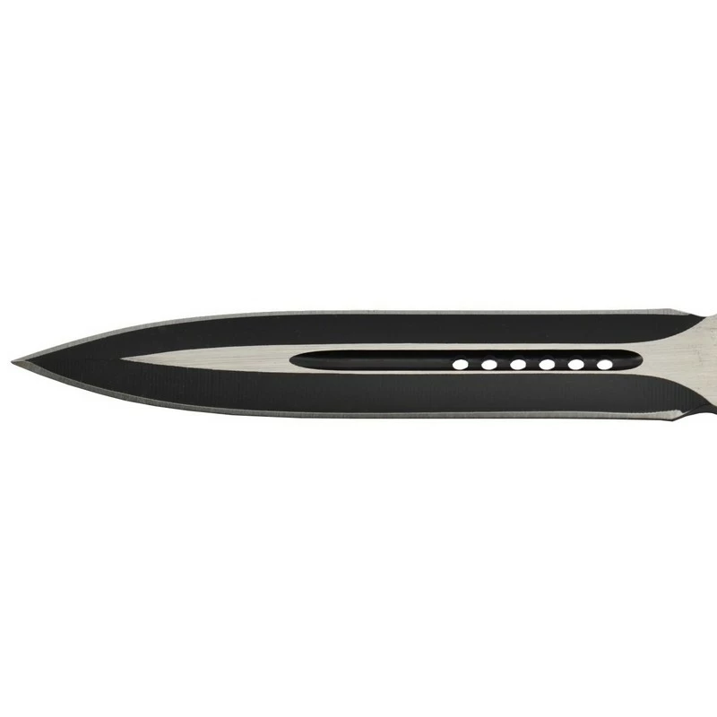Lame en acier inox 440C double tranchant à trous, d’une longueur de 8,5 cm.