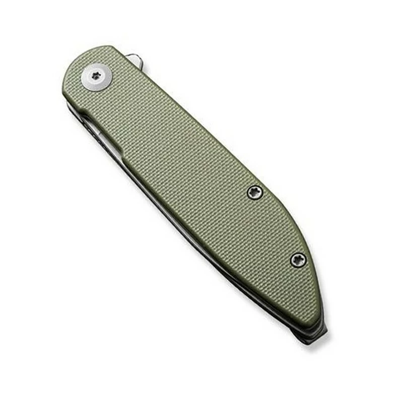 Manche en inox avec plaquettes G10 vert, d’une longueur de 9,5 cm.