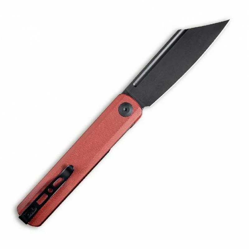 Lame tanto inversé en acier 9Cr18MoV finition « blackwash » avec « front flipper », mécanisme « Ball bearing » et cran intérieur, d’une longueur de 9 cm.