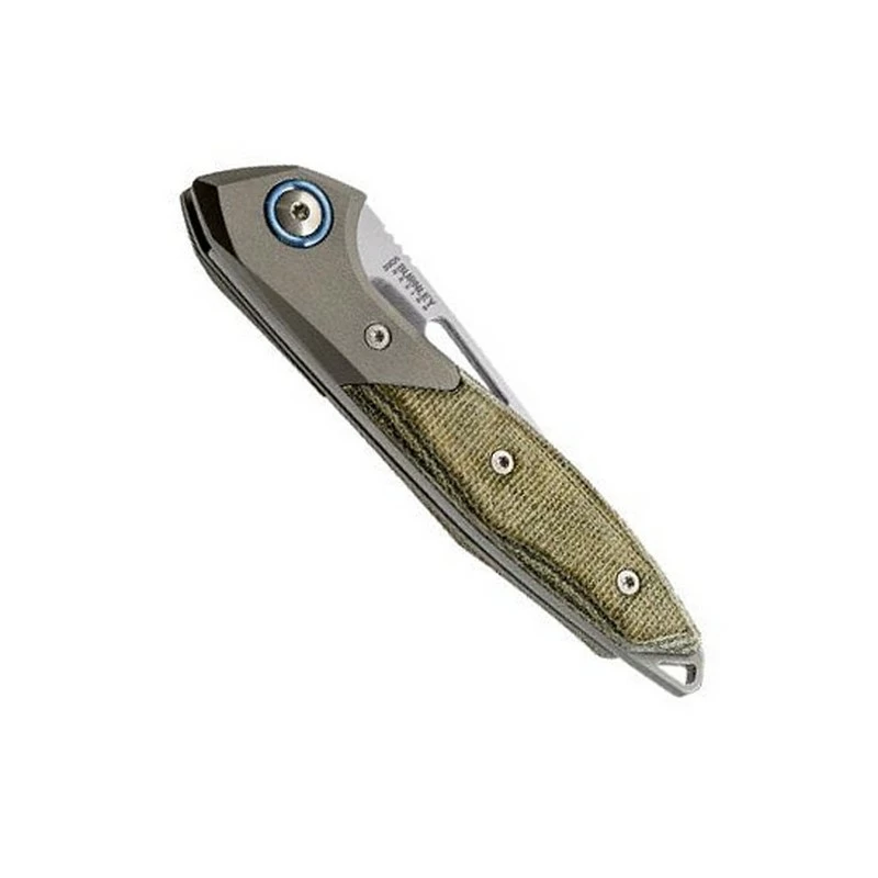 Manche en micarta vert, mitre titanium 6AL4V avec pivot en titanium anodisé bleu, d’une longueur de 10 cm.