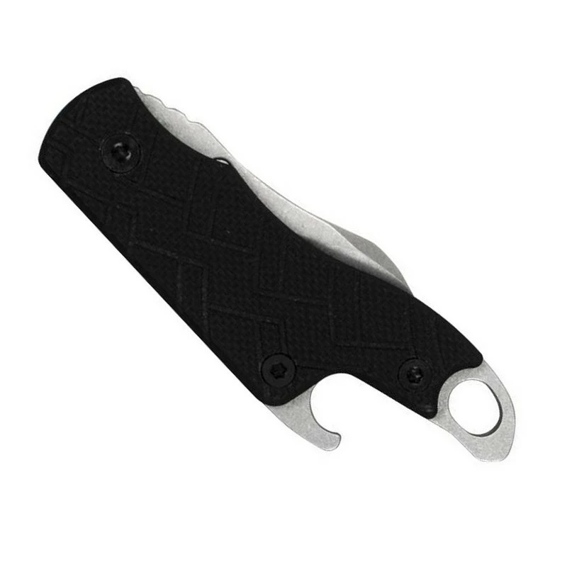 Lame en acier inox 3Cr13 finition « stonewashed » à cran intérieur et à bouton.