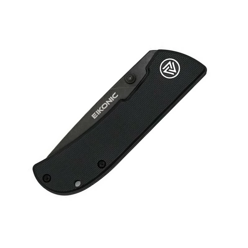Manche en acier inox noir avec plaquettes en G10 noir, d’une longueur 10 cm.