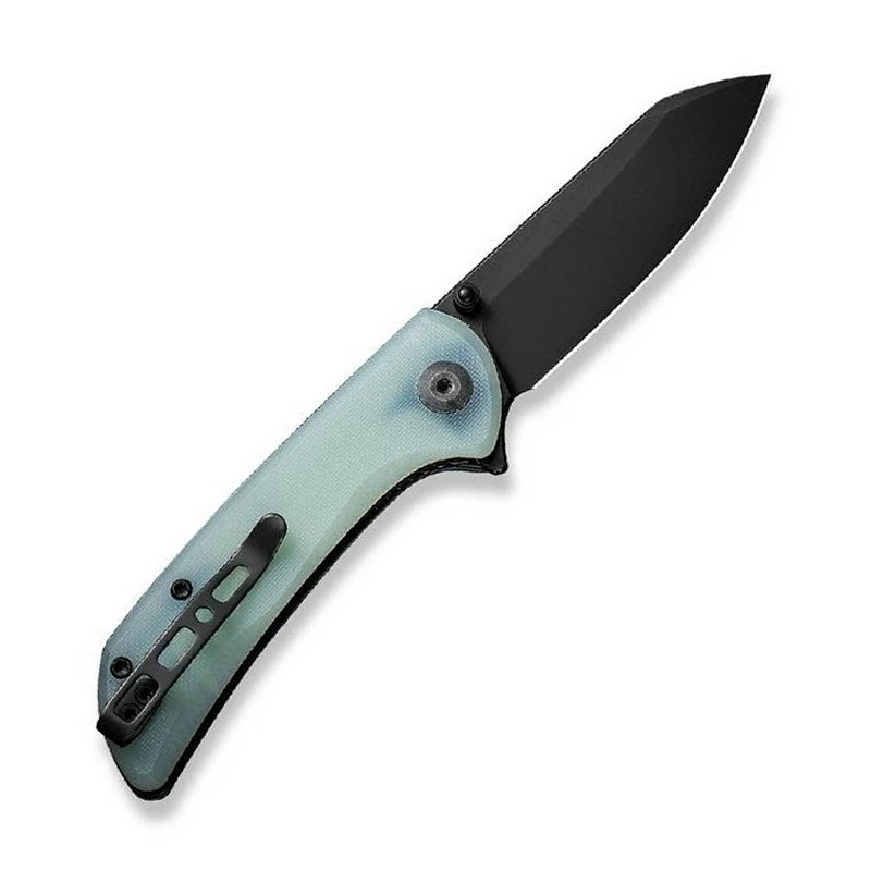 Lame en acier 9Cr18MoV finition « blackwash » avec « flipper », mécanisme « Ball bearing », à cran intérieur et à bouton double, d’une longueur de 7,5 cm.