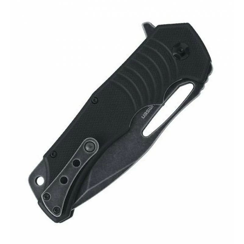 Lame noire à trou en acier inox 440C finition « stonewashed » avec « flipper » et cran intérieur.