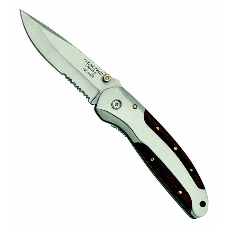 Lame en acier inox à dents, à cran intérieur et à bouton