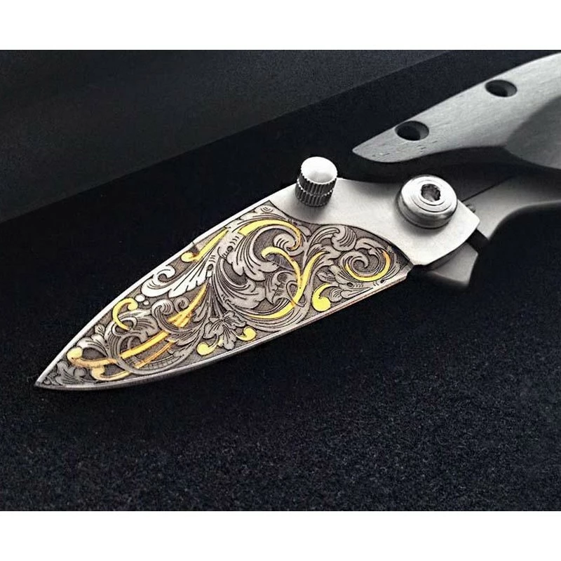 Lame en acier inox 440C satiné à cran de verrouillage intérieur, gravure or 24 carats déposé par un procédé électrochimique.