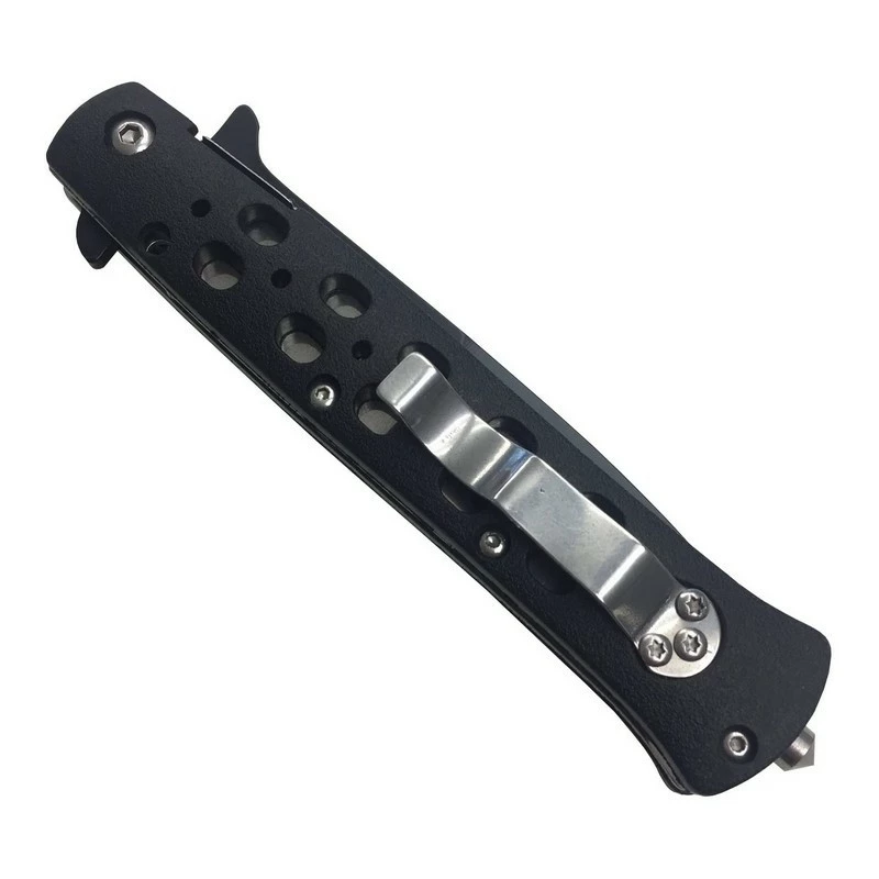 Lame noire en acier inox avec système d’ouverture assistée, d’une longueur de 10 cm.