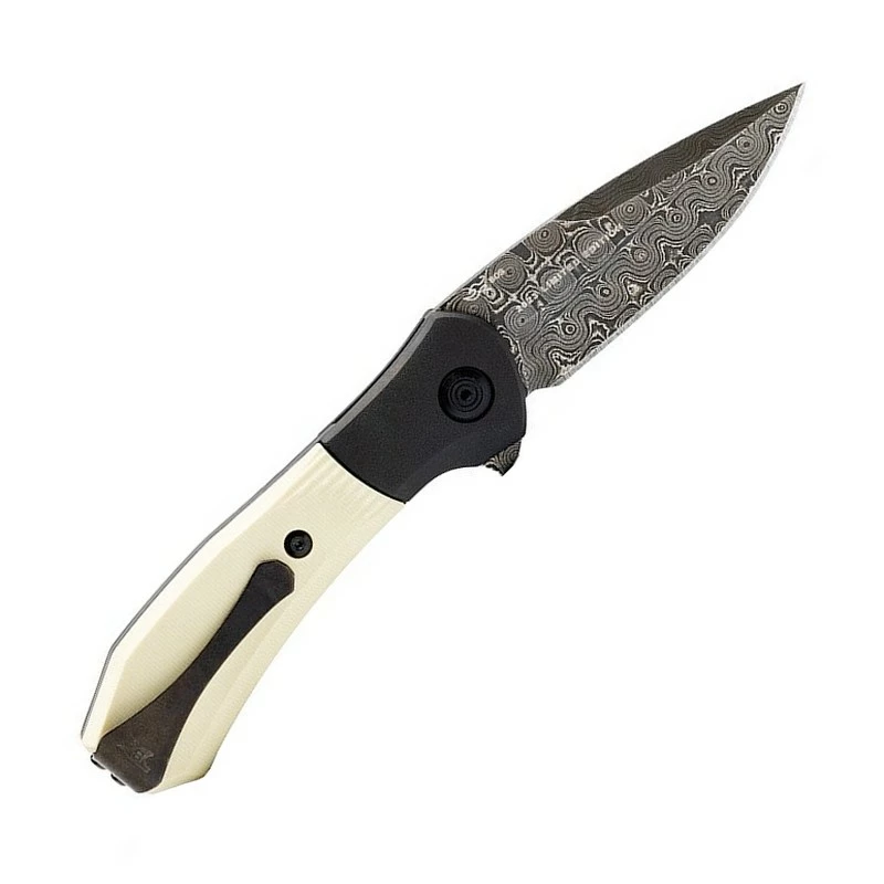 Lame drop-point en acier damas avec « flipper », système d’ouverture assistée (ASAP) et mécanisme de blocage (SHIFT).