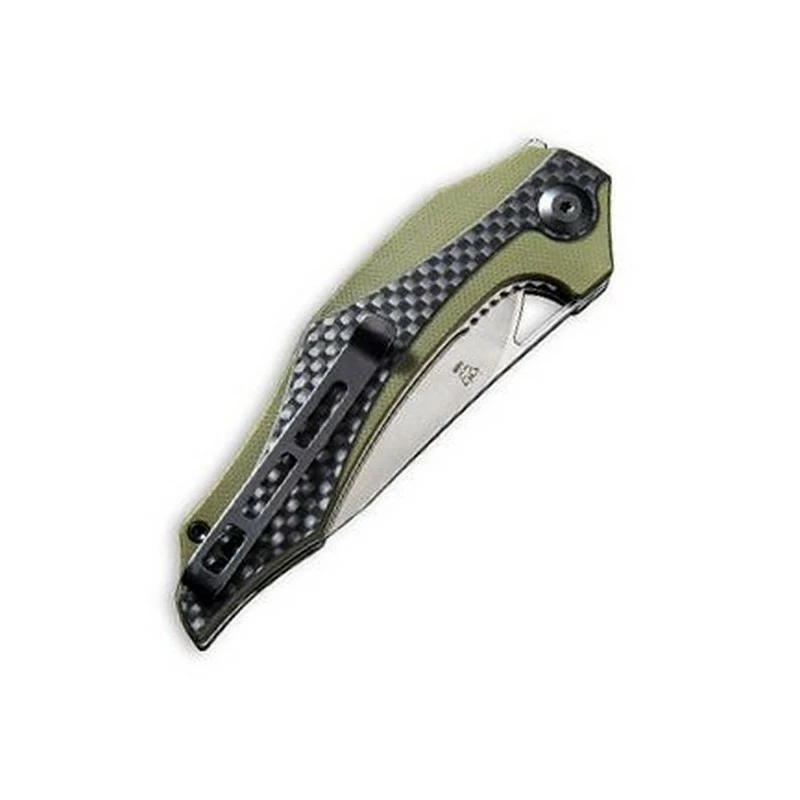 Manche en acier inox avec plaquettes G10 brun, ver ou noir (choisir lors de la commande) et inserts fibre de carbone noir, d’une longueur de 11,5 cm.