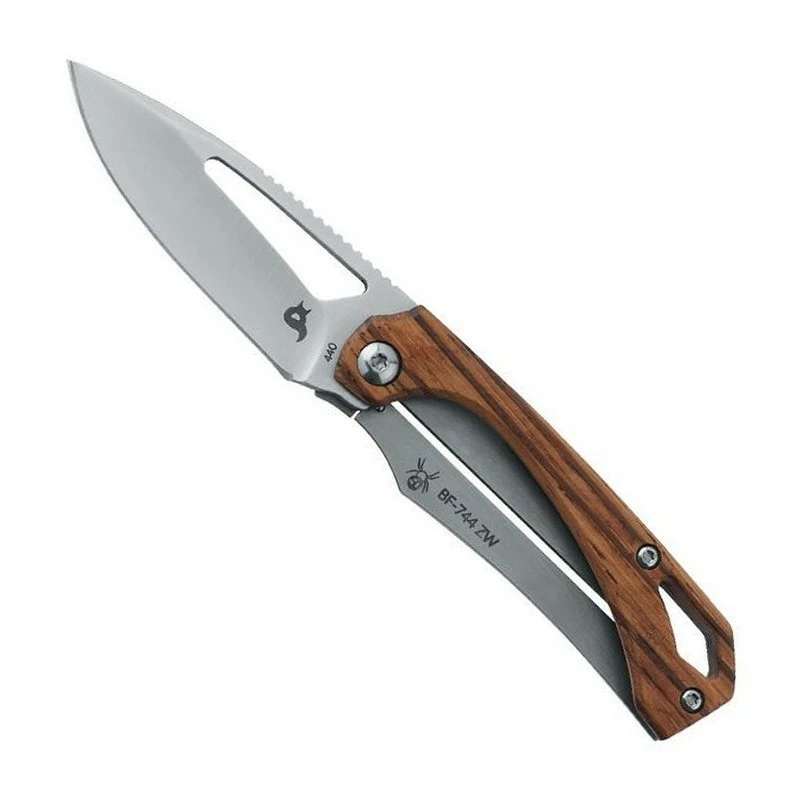 Manche en bois de zébra au recto et acier inox au verso, d’une longueur de 8 cm.