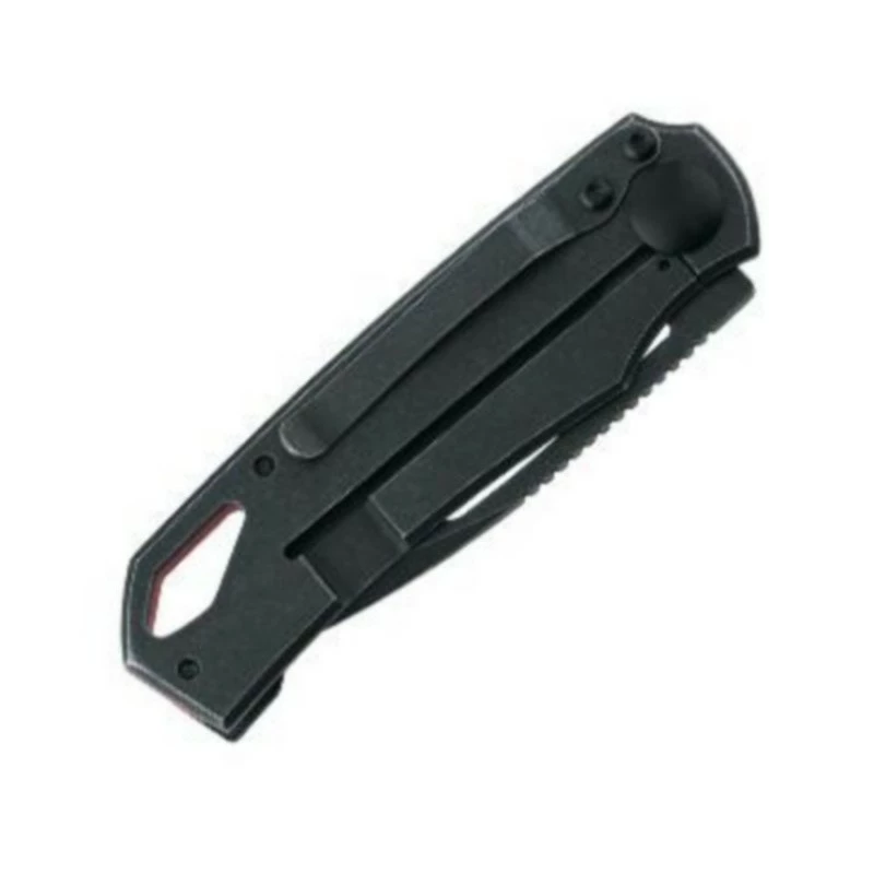 Manche en G10 noir au recto et acier inox au verso, entretoise aluminium anodisé rouge, d’une longueur de 8 cm.