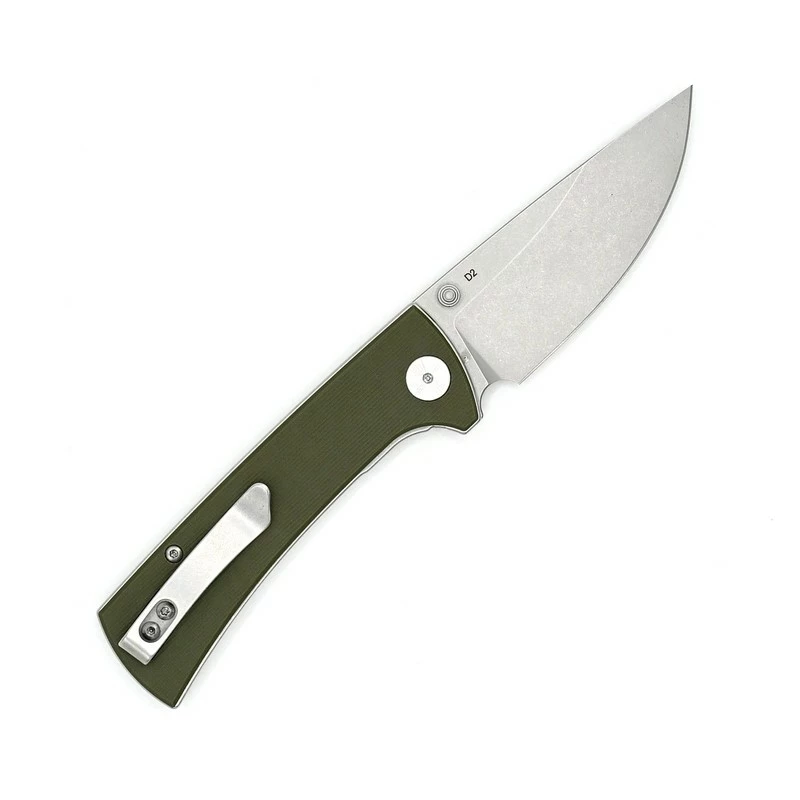 Lame en acier D2 satiné avec finition « stonewashed » à cran intérieur et à bouton double, d’une longueur de 7,5 cm.