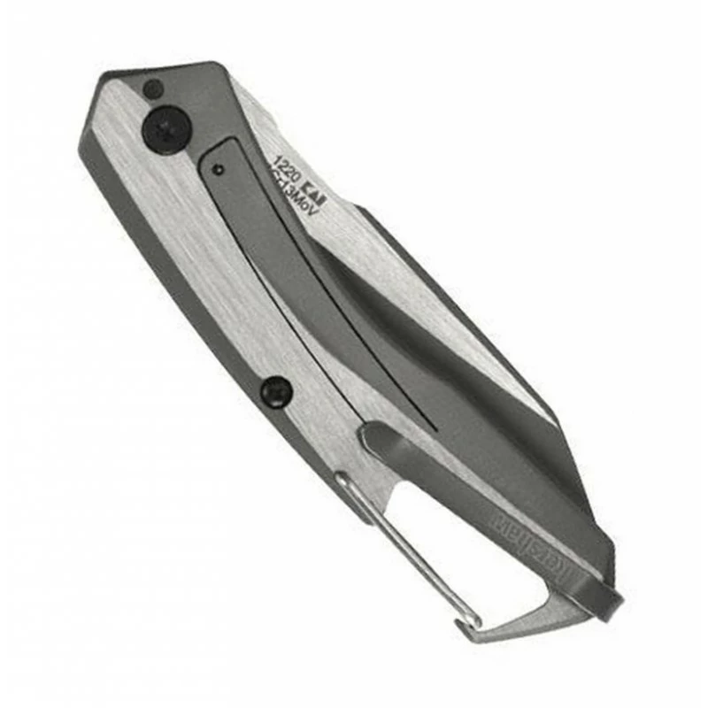 Lame en acier inox 8Cr13MoV avec revêtement nitrure de titane et satiné à cran intérieur.