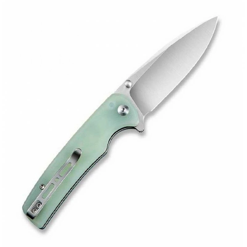 Lame en acier 9Cr18MoV satiné avec « flipper », mécanisme « Ball bearing » et bouton de verrouillage/déverrouillage, d’une longueur de 9,5 cm.