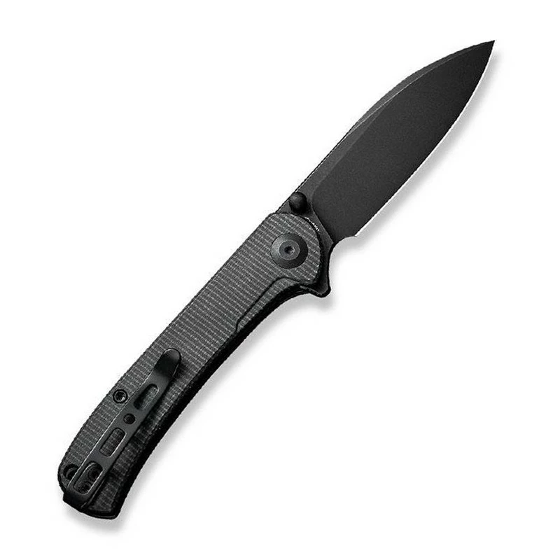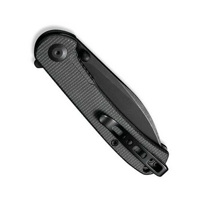 Lame en acier 9Cr18MoV finition « blackwash » avec « flipper », mécanisme « Ball bearing », cran intérieur et à bouton double, d’une longueur de 8 cm.