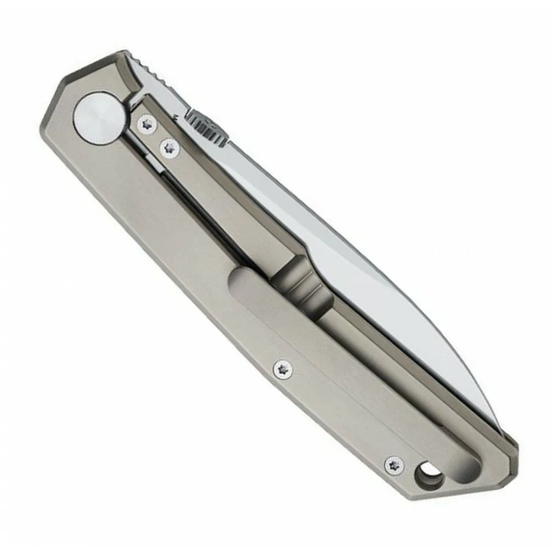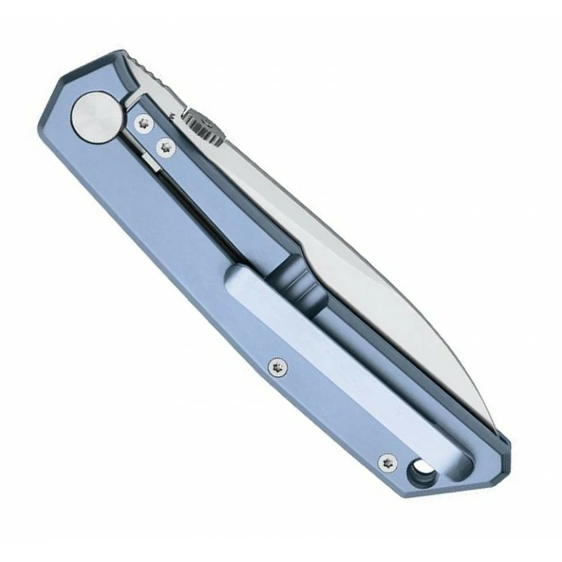 Lame en acier inox N690Co finition « stonewashed » à cran intérieur et à bouton plat.