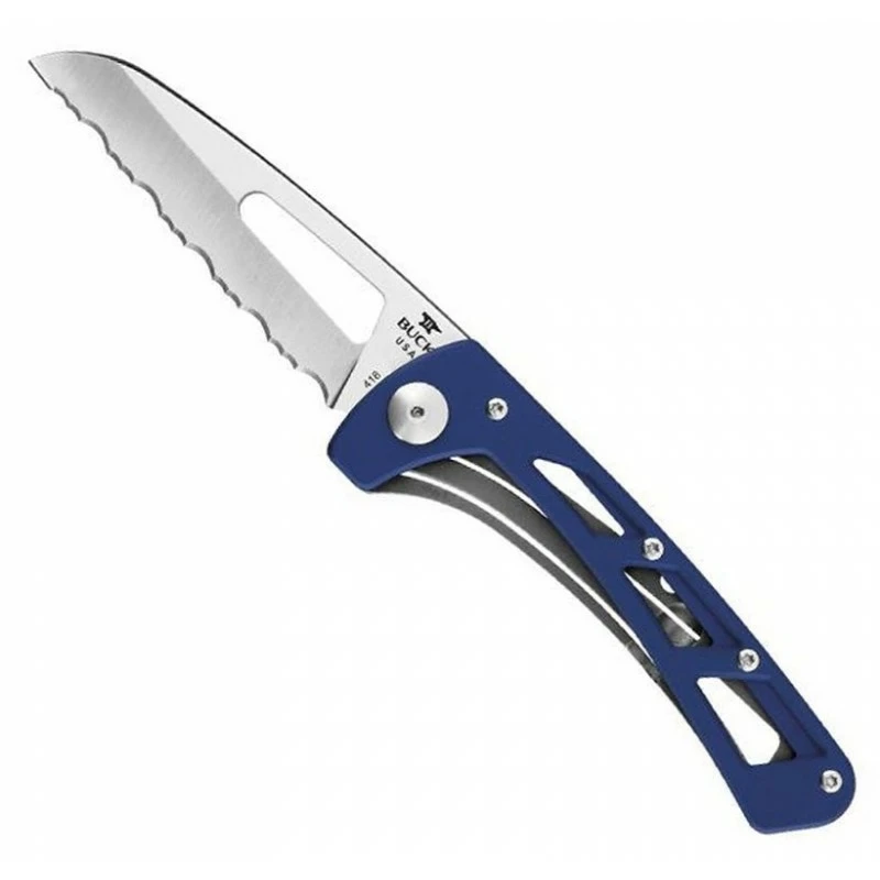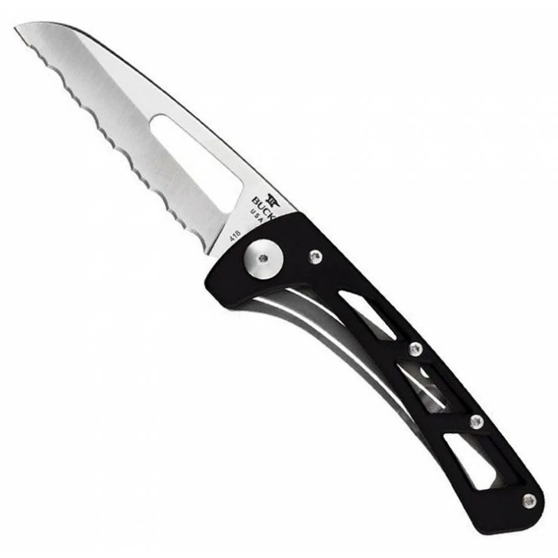Lame en acier inox 420 à dents, à trou et à cran intérieur.